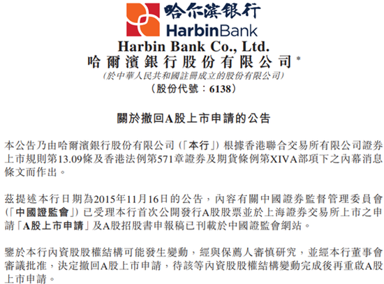 公开资料显示,哈尔滨银行成立于1997年2月,总部位于哈尔滨市。2014年3月31日,哈尔滨银行登陆香港联交所。紧接着,在2015年,哈尔滨银行便提出了在A股上市的计划,意图实现“A+H”两地上市。但在2018年3月16日,哈尔滨银行突然发布了《关于撤回A股上市申请的公告》,公告指出,“鉴于本行内资股股权结构可能发生变动,经与保荐人审慎研究,并经本行董事会审议批准,决定撤回A股上市申请,待该等内资股股权结构变动完成后再重启A股上市申请。”同年3月28日,证监会对哈尔滨银行的A股IPO作出了终止审查的决定。