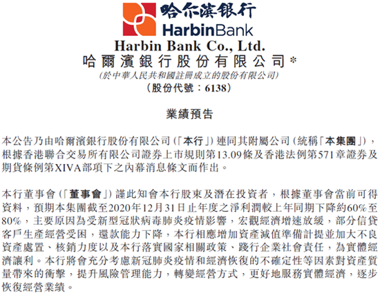 就在3月16日晚间,哈尔滨银行发布《业绩公告》,该行预计其2020年度的净利润会同比下降约60%到80%。对于净利润“断崖式”的下滑,哈尔滨在《业绩公告》中解释称,“主要原因为受新型冠状病毒肺炎疫情影响,宏观经济增速放缓,部分信贷客户生产经营受困,还款能力下降,本行相应增加资产减值准备计提并加大不良资产处置、核销力度以及本行落实国家相关政策、践行企业社会责任,为实体经济让利。”