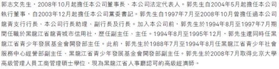 作为邓新权的前任,履历显示,郭志文出生于1967年6月,自2008年10月起即担任哈尔滨银行董事长。