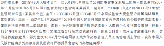 今年2月24日,哈尔滨银行发布公告,郭志文退任该行董事会。同日,邓新权被哈尔滨银行董事会选为董事长,彼时邓新权的任职资格尚需监管部门核准。