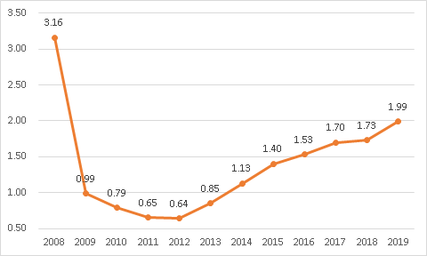 而就不良贷款率来看,哈尔滨银行在2012年—2019年期间连续上行。此外,2019年,哈尔滨银行也出现了近10年来总资产的首次下滑,从2018年末的6155.88亿元降至2019年末5830.89亿元。
