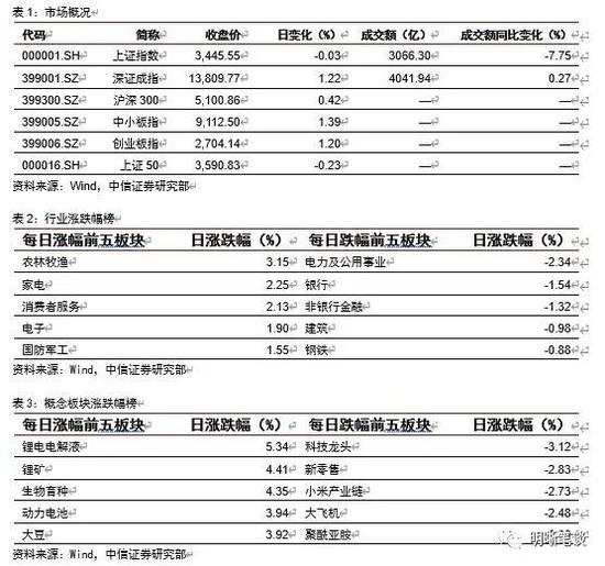 2021年3月17日,银存间质押式回购加权利率大体上行,隔夜、7天、14天、21天和1个月分别变动了-13.14bps、-8.15bps、-16.35bps、10.68bps和-6.91bps至1.99%、2.14%、2.12%、2.62%和2.70%。国债到期收益率全面下行,1年、3年、5年、10年分别变动-2.34bps、-1.76bps、-0.64bps、-0.50bps至2.64%、2.94%、3.06%、3.26%。上证综指下跌-0.03%至3445.55,深证成指上涨1.22%至13809.77,创业板指上涨1.20%至2704.14。