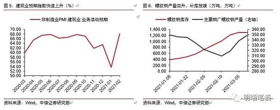 此外,2月建筑业预期指数明显上行,或表明当前市场主体对施工进度加速的预期较强,同时考虑到近期螺纹钢产量上行+价格高位+补库放缓,近期基建投资或有一定的回暖可能。国家统计局数据显示,2月建筑业商务活动指数录得54.7%,较1月回落5.3pcts,但其业务活动预期指数录得68.2%,较1月上升14.6pcts,为2019年以来的最高水平。结合来看,我们认为这反映出建筑企业对后续经营回暖、工程进度加速的预期,这也可能在一定程度上预示着后续基建投资仍有边际上行的空间。另一方面,近期螺纹钢呈产量持续上行+价格维持高位+库存回补放缓的特征,这可能说明当前建筑施工需求仍然较旺,同时也在一定程度上说明近期基建投资仍有一定的回暖可能。
