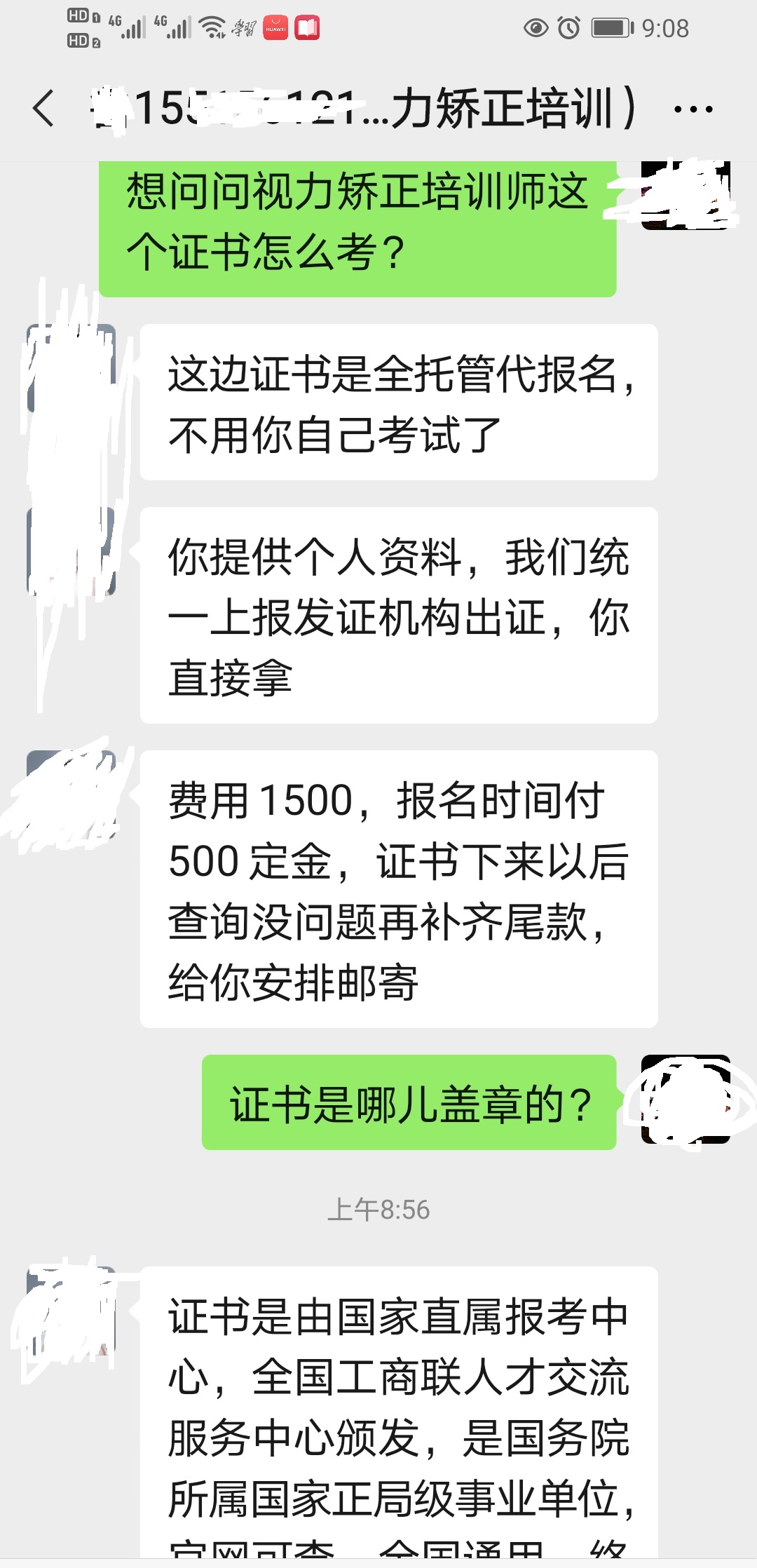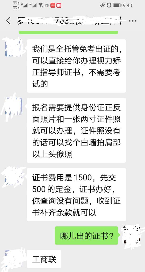 虽然时间短一点,但这种方式至少还有两天培训,而另外几家注册地在京外的机构,连两天的培训也省了。据对方介绍,只需要1500元,就可以拿到高级视力矫正师的证件。“把照片和基础信息告诉我们就行,先交500元定金,等证件办下来,你查询确认好了,再付尾款。您不用过来,也不需要学习。”