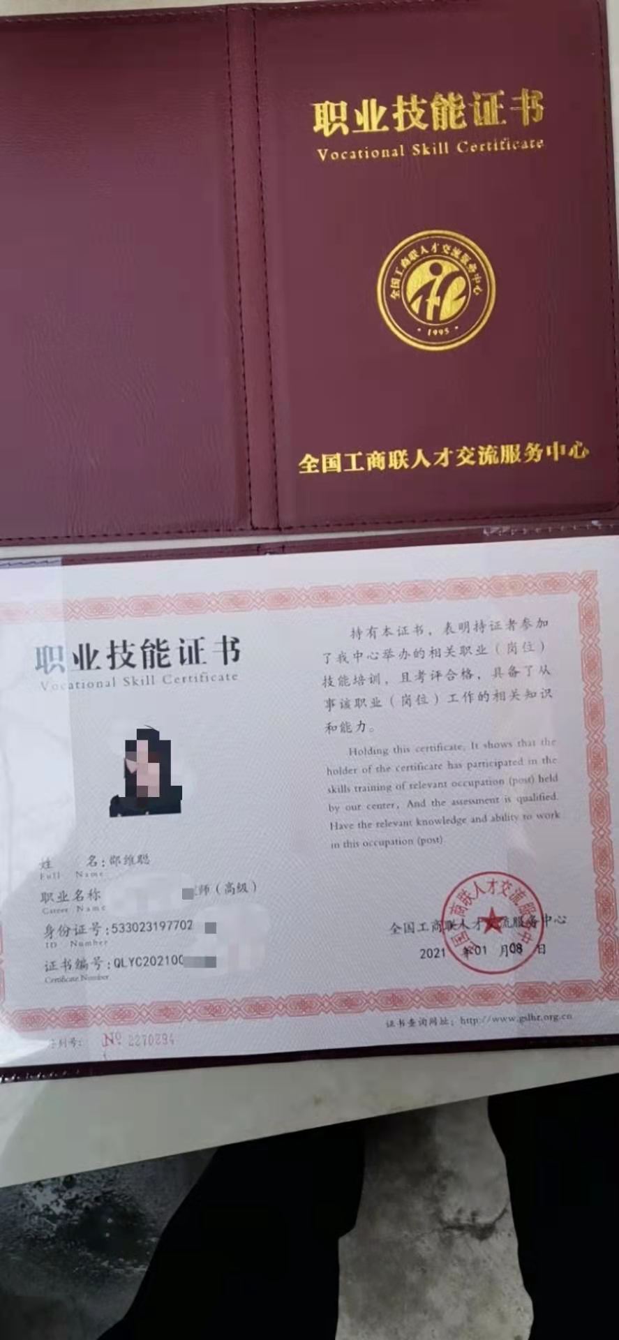 一名推销员还给记者发来了他们所能提供证书的样本,证书持有人的照片和身份证号都已经被模糊处理。“别人的证书我们不能给你看那么具体,不然就暴露别人的隐私了。你要想办,就先交定金,你自己的证很快就能下来,到时候你再去查,保证能查到。”这名推销员保证。记者询问是否还能提供短期的技能培训,对方很不屑地反问,“你觉得两天能学到什么?他们不过是借着这个名头又挣一笔钱,哪有我们这个方式实在。”