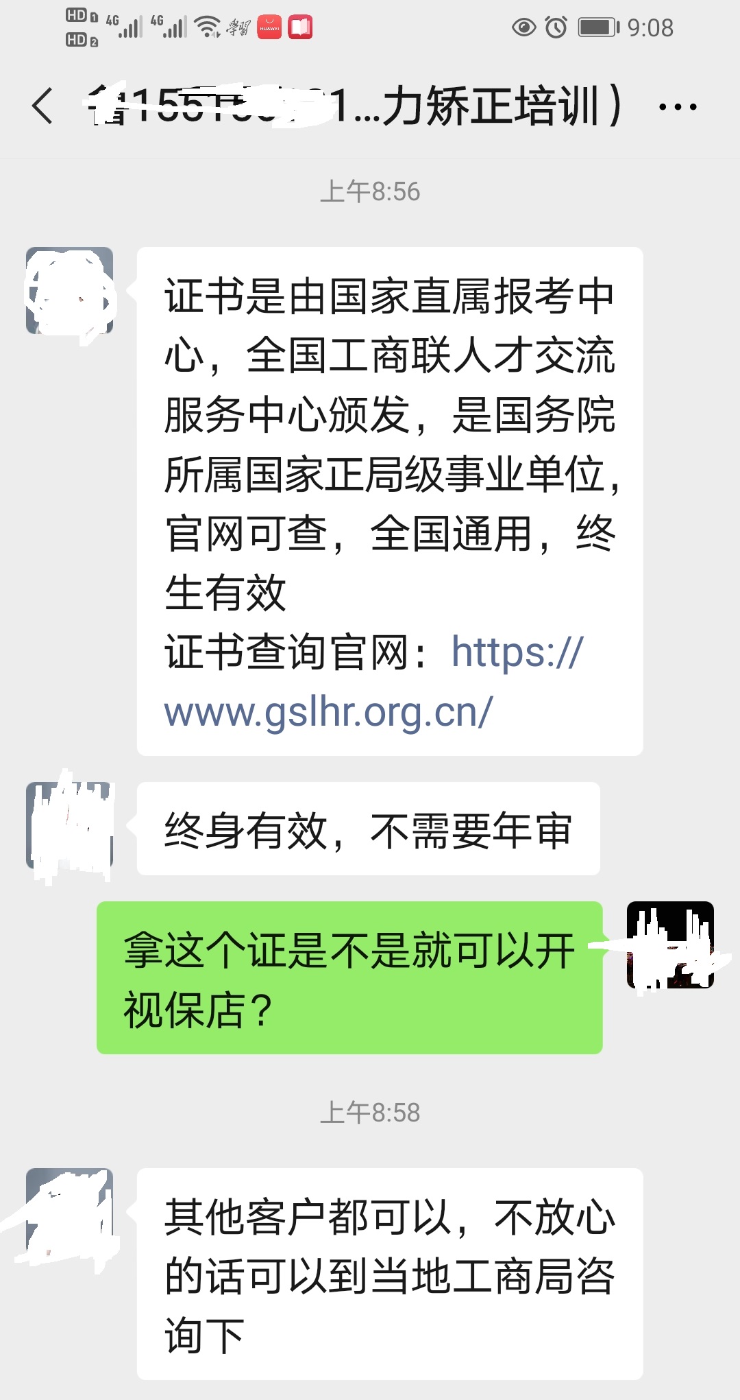 在调查中,记者找到一家与按摩店合作的培训机构。工作人员称,只需要交3680元,经过两天基础培训,就可以拿到高级视力矫正师证书。尽管记者再三强调自己没有任何基础,也不懂医学知识,对方还是安慰说,“不需要有太多基础,‘老师们’会教给学员按摩手法,两天之内保证学会。”在记者试图压价时,对方还算了一笔账,近视调理按摩,行业内通行的上门服务价格都在每次380元以上,只要10次就能挣回培训费,“您还自己开店,就花这么点钱,这个证很值的。”