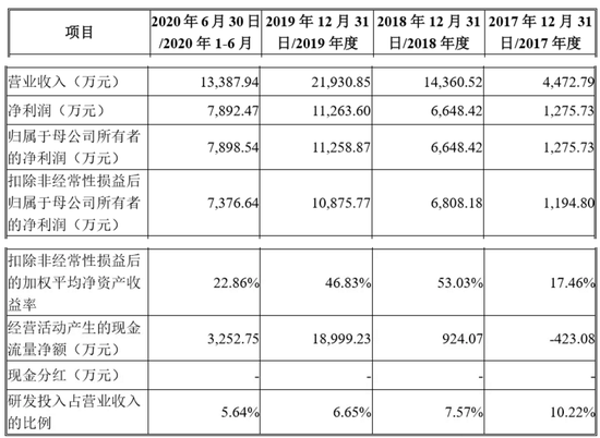 2017年、2018年、2019年及2020年上半年,公司营业收入分别为0.45亿元、1.44亿元、2.19亿元及1.34亿元,扣非归母净利润分别为0.12亿元、0.68亿元、1.09亿元及0.74亿元,净利润增长速度很快。