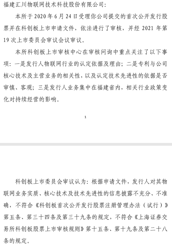 3月18日晚上,上交所公布《关于终止福建汇川物联网技术科技股份有限公司首次公开发行股票并在科创板上市审核的决定》。《决定》指出:本所科创板上市审核中心在审核问询中重点关注了以下事项:一是发行人物联网行业的认定依据及理由;二是专利与公司核心技术及主营业务的相关性,以及认定技术先进性的依据是否审慎、客观;三是发行人业务集中在福建省内,相关行业政策变化对持续经营的影响。科创板上市委员会审议认为:根据申请文件,发行人对其物联网业务实质、核心技术及技术先进性的信息披露不充分、不准确,不符合《科创板首次公开发行股票注册管理办法(试行)》第五条、第三十四条及第三十九条的规定,不符合《上海证券交易所科创板股票上市审核规则》第十五条、第十九条及第二十八条的规定。结合科创板上市委员会审议意见,本所决定对你公司首次公开发行股票并在科创板上市申请予以终止审核。