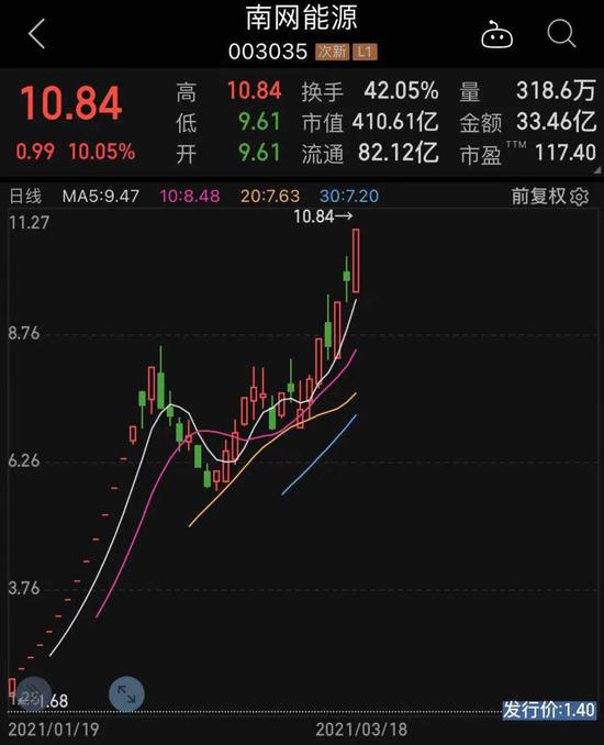 伴随着碳中和的浪潮,南网能源股价一飞冲天。截至最新,南网能源收盘价10.84元/股,创历史新高,A股市值突破400亿元。近两个月时间里,与发行价对比,该股累计涨幅达到6.74倍。