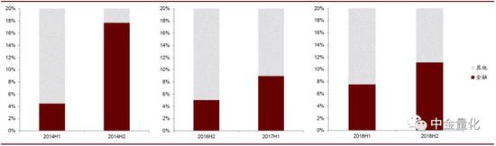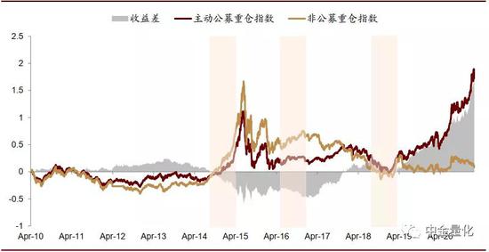 当主动重仓指数回调时,主动基金倾向加仓金融板块。我们以公募主动股票型基金每季度公布的十大重仓股构建重仓股指数。2010年以后,重仓股指数较非重仓股指数收益经历了三次较为明显回调,分别为2014年末、2016年末至2017年初以及2018年末。而在这三段时间,主动公募基金均有增持金融行业。