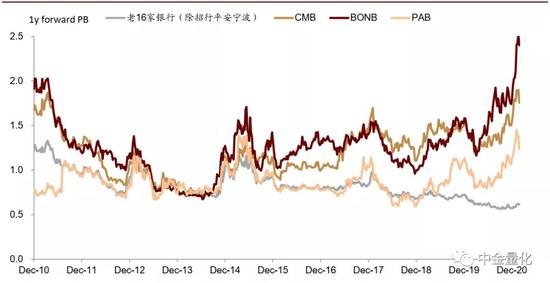 图表:P/B在1x左右的银行已逐渐切换为PEG估值