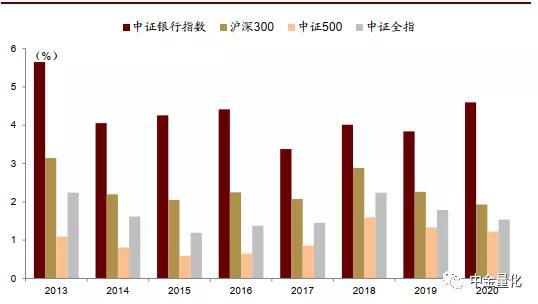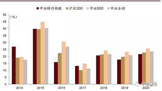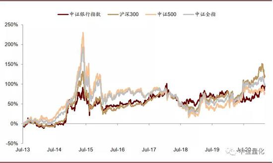 中证银行指数历史表现平稳。中证银行指数(399986.SZ)于2013年7月15日发布,指数根据中证二级行业分类筛选所有属于银行业公司,并通过过去一年日均总市值选出市值最大50家公司。但由于目前属于银行业公司数量不足50家,因此指数选取所有银行业公司作为成分。自发布以来,指数长期表现平稳,移除2014年指数大幅走高带来的上行波动外,整体波动率较沪深300、中证500等规模指数低。