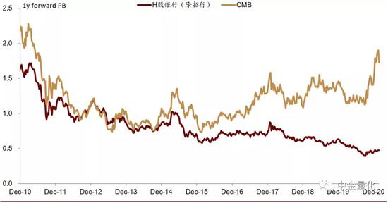 图表:目前A/H银行远期市净率分别为0.9/0.7x 远期P/B,如果剔除招行、宁波、平安后,A/H银行估值仅为0.6/0.5x