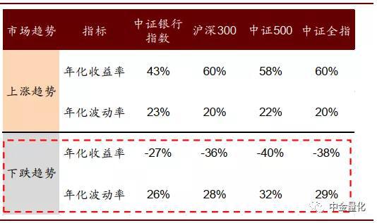 图表:当市场处于下跌趋势时,中证银行指数相对抗跌,且波动率较低