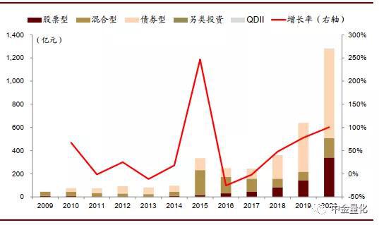图表:截止2020年年底,天弘基金非货币基金管理规模为1,282亿元,创历史新高