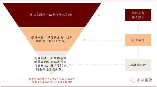 全行业覆盖指数。中证银行指数(399986.SZ)于2013年7月15日发布,指数根据中证二级行业分类筛选所有属于银行业公司,并通过过去一年日均总市值选出市值最大50家公司。但由于目前属于银行业公司数量不足50家,因此指数选取所有银行业公司作为成分。