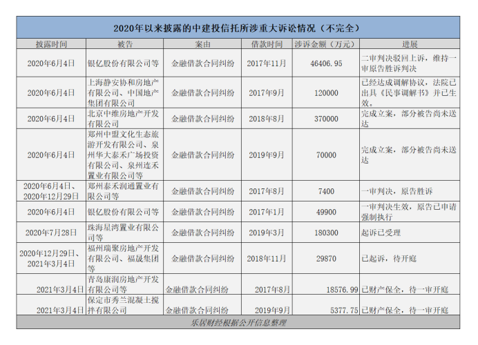 有些公司涉案金额较大。如与珠海星湾置业有限公司的纠纷,涉及金额达18亿元;与上海静安协和房地产有限公司签署的贷款合同,涉及金额12亿元;还有已进入破产重整阶段的银亿股份,中建投信托曾两度向其发放贷款,合计9.6亿元。