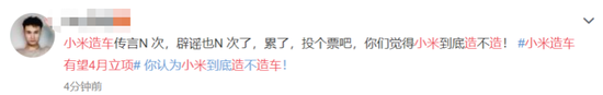此前,小米曾多次辟谣,澄清造车未到正式立项阶段。因此,不少网友表示在官方公告没有出来之前,小米到底造车还不一定,一切皆有可能。