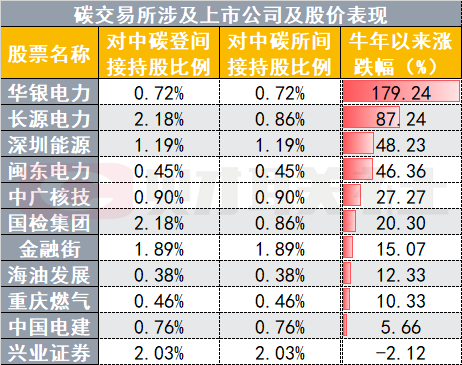 由此计算的各上市公司合并间接持有全国碳市场两大交易机构的股权比例如下。其中,华银电力、长源电力牛年以来累计涨幅遥遥领先。