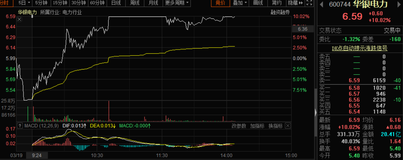 板块“领头羊”华银电力今日更是走出“地天板”走势,以近跌停价开盘,随后震荡上行,盘中几度触及涨停,换手率近40%。一个月前华银电力股价最低仅为2.34元/股,最新报6.59元/股,飙涨180%。