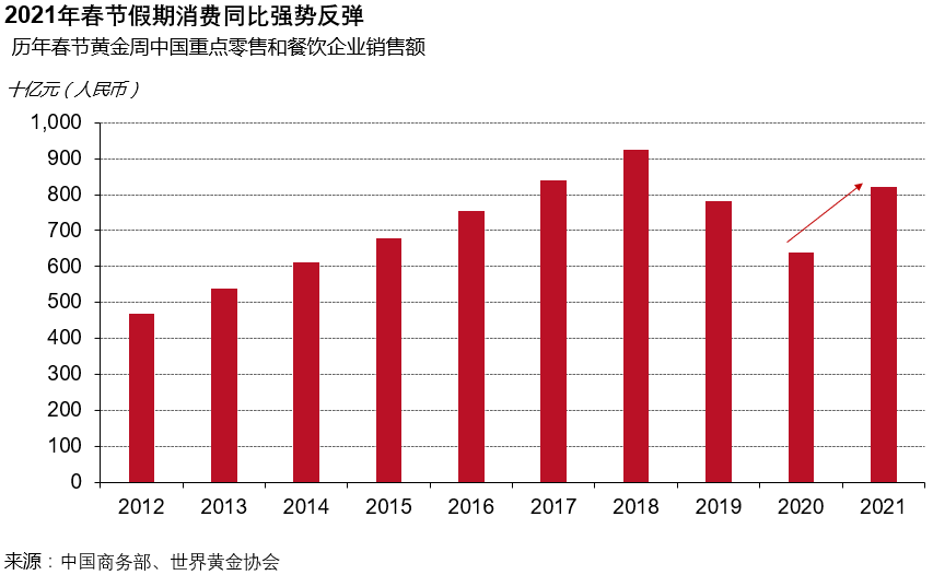 2021年春节假期期间中国零售消费强势反弹。根据商务部的数据,春节假期全国重点零售和餐饮企业实现销售额8210亿元,同比增长28.7%,比2019年春节黄金周增长4.9%。