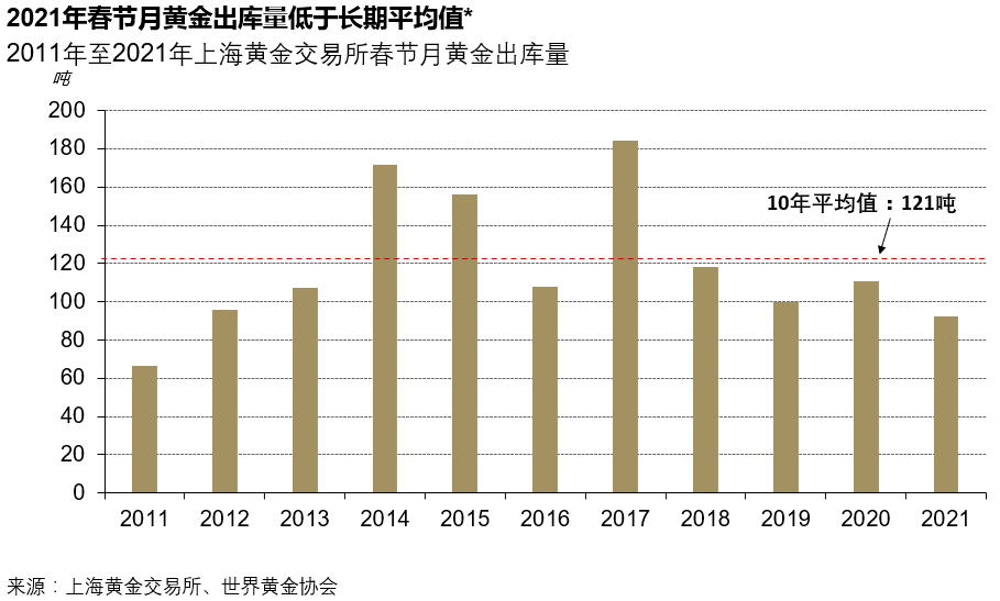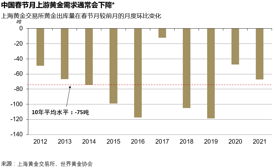 *注:月度环比变化根据2011年至2021年春节假期月及前一个月上海黄金交易所黄金出库量的情况计算得出。