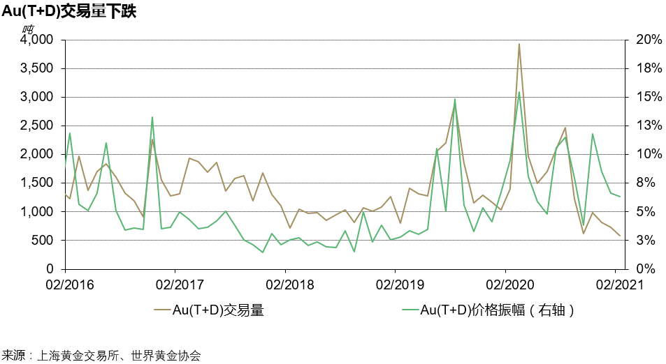 2月Au(T+D)交易量为581吨,比上月减少148吨,比2020年同期减少821吨(主要原因为2月交易天数少);