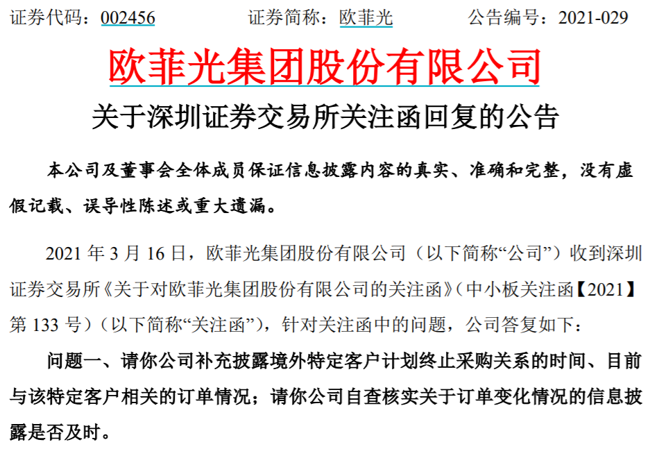 连续大跌之后,欧菲光正式回应市场关注的焦点问题。3月19日晚间,欧菲光在《关于深交所关注函回复的公告》中回应,于2021年3月12日收到境外特定客户相关业务人员的电话通知,境外特定客户计划于2021年第2季度终止采购关系,后续将签署终止合作协议。据初步统计,2021年1-2月,来源于特定客户的相关收入同比增长5.52%,订单状况正常,预计相关订单出货将持续到3月31日。