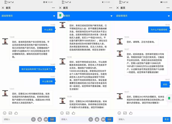 比如,开始时说是用户填写的银行卡有误,触发安全系统,导致账户被冻结,需要转入与账户余额同等金额的认证金解冻,如果没有在24小时内解冻,系统将每日扣取账上余额5%的保管金。解冻完成后,又说顾客在平台的流水不满足提现的最低标准,要在当天满足本金8倍的流水标准,才可以提现。如果不想完成流水标准,可以缴纳账户余额50%的保证金,才能将本金、利息一并提取出来。如果没在24小时内缴纳保证金,系统将每日扣取账上余额5%的保管金。