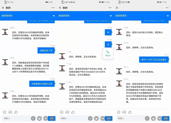 这期间,客服还提到,刘女士未缴纳所得税,有偷税漏税嫌疑,需要缴纳余额5%的保证金,如果24小时内未缴纳,则系统自动每日扣除余额5%。