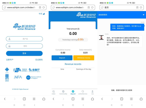 让刘女士的多年积蓄在一周之间如同泥牛入海的“SinaFinance”理财网站(http://www.ezhipin.com.cn/)和App,对外称其提供理财、外汇、比特币、黄金等信息,并在显著位置显示