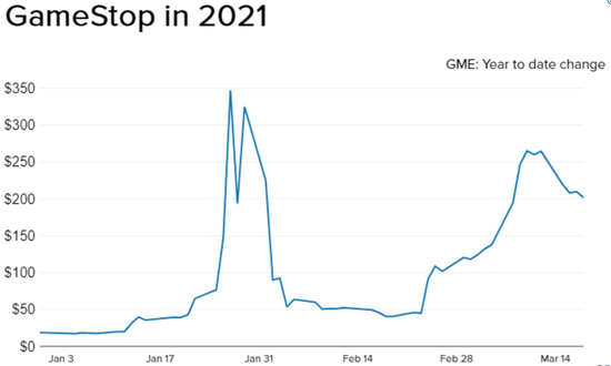 3月份GameStop股价上涨了98%,但交易量与1月份时相比已经大幅下降。