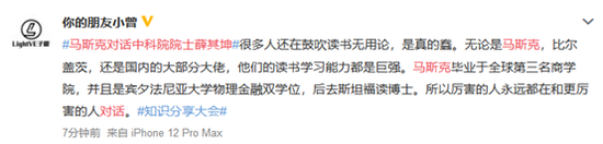 对此,有网友评论称,无论是马斯克,比尔盖茨,还是国内的大部分大佬,他们的读书学习能力都是巨强。马斯克毕业于全球第三名商学院,并且是宾夕法尼亚大学物理金融双学位,后去斯坦福读博士。所以厉害的人永远都在和更厉害的人对话。
