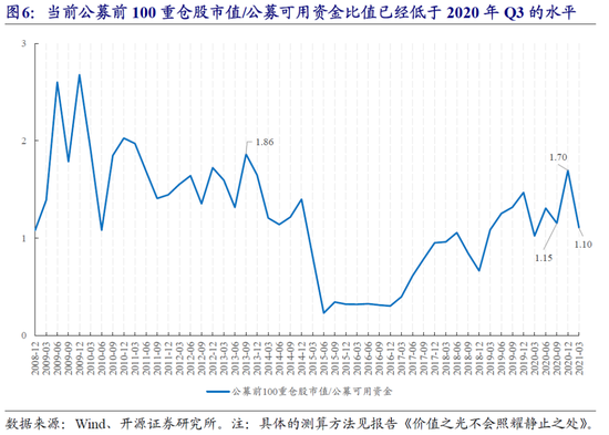 尽管以大盘成长为代表的“核心资产”仍面对较大的“还债”压力,但如果从“去杠杆”角度来看,上述资产离阶段性的企稳从交易层面来看已有可能。我们曾在报告《价值之光不会照耀静止之处》中提到,可以用公募基金前100重仓股的持仓市值与公募基金可用资金的比值作为抱团股的“杠杆”效应衡量指标,即单位可用资金所能拉动的抱团股持仓市值变动,发现该比值在2017年Q1之后逐步抬升至2020年Q4(1.70)。当下出现的积极变化是截至2021年3月19日该比值已经大幅回落至1.10,已经低于2020年Q3的水平,而2020年Q3市场的抱团以及分化程度并未像2021年春节前极致,这意味着核心资产离阶段性的企稳从交易层面已有可能。