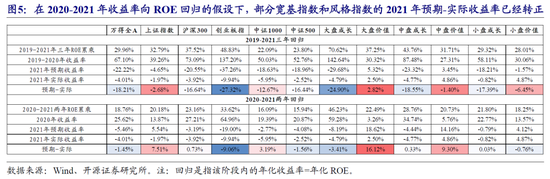(1)首先,从长期收益率向ROE回归的视角来看,部分宽基指数和风格指数的2021年预期-实际收益率已经转正。如果认为2019年的估值扩张是合理的,而2020年由于疫情带来的流动性宽松导致的估值扩张是需要2021年的盈利来消化的,则在2020-2021年两年收益率回归ROE的假设下,宽基指数中上证指数、沪深300以及中证1000的预期-实际收益率其实已经转正,而风格指数中除了大盘成长和小盘价值以外,其他也都已转正。