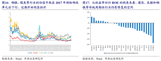 碳中和的长期目标和当下的限排限产措施正在推动部分传统周期性行业产能价值的回归。过去在产能周期下行的过程中,对应板块的估值中枢也在趋势性下移,如钢铁、煤炭等,这些行业曾在2016-2017年供给侧改革时估值大幅抬升,但由于2017年之后限排限产的强度有所下降, 2018年钢铁、煤炭明显增产,导致市场对于产能出清的预期并不稳定,这也是当下市场的主要疑虑。但正如我们在报告《未有之变——开源“碳中和”策略篇》中提到的,火电、钢铁以及非金属矿物制品是全国碳排放的主要来源,要想在2030年前完成碳达峰的目标,这些重点行业的单位产出碳排放的降低是十分必要的;同时碳排放权价值的抬升也将使得污染成本提高。因此投资者不应简单地认为碳中和也只是一时之策,而应该认识到碳中和促进了限产限排的长效机制形成,这将稳定部分行业产能价值回归的长期预期。另外,过去两年部分行业的收益率与ROE之间的差距也需要修复,当下仍处在修复的区间。