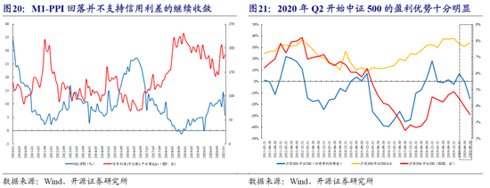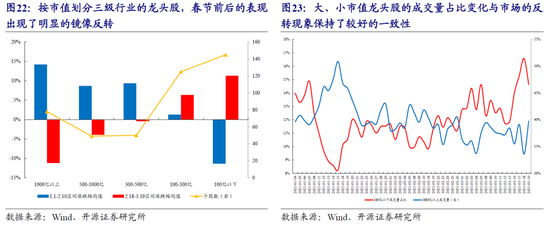 对于中小市值而言,尽管很难出现贴现率下行带来的全面估值驱动行情,但本身的盈利修复已经被市场逐步定价,未来对于盈利的挖掘仍是重点。正如我们在报告《贴现率的迷思》中提到的,由于中小市值企业的经营风险较大,因此其贴现率更多的锚定国内信用利差,而当下M1-PPI的回落以及未来信用收缩的预期并不支持信用利差进一步回落,因此对于中小市值而言很难出现贴现率下行带来的全面估值驱动行情。但从业绩的相对增速优势来看,其实2020年Q2开始中证500的盈利增速已经明显相较于沪深300占优,而且二者ROE的差距也在收敛,这一点已经逐步被市场所认知到并定价:我们统计了三级行业营收第一、第二股票(营收角度的龙一、龙二)在2021年1月1日-2月10日(春节前)和2021年2月18日-3月19日(春节后)的区间涨跌幅,并按照市值划分计算均值:发现在春节前市值大小与涨跌幅呈现正相关关系,而春节后出现了明显的反转,市值越小的龙头股票市场表现反而明显占优;同时从成交量占比的视角来看,大市值龙头股成交量占比在大幅波动中震荡下行,而小市值龙头股成交量占比明显上行。