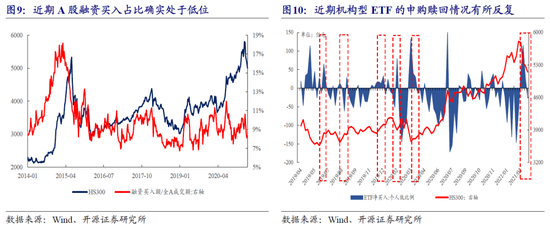 (3)最后,从融资买入和机构ETF的申购赎回行为来看,历史上市场阶段性见底时往往伴随着融资买入处于低位、机构型ETF被净申购:近期A股融资买入占比确实处于低位,但机构投资者近期并未积极申购ETF。