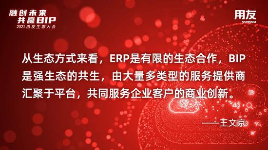 ERP带给企业的价值是“流程优化,效率提升”,BIP则是直接作用于企业商业创新,帮助企业重构发展力。从生态方式来看,ERP是有限的生态合作,BIP是强生态的共生,由大量多类型的服务提供商汇聚于平台,共同服务企业客户的商业创新。