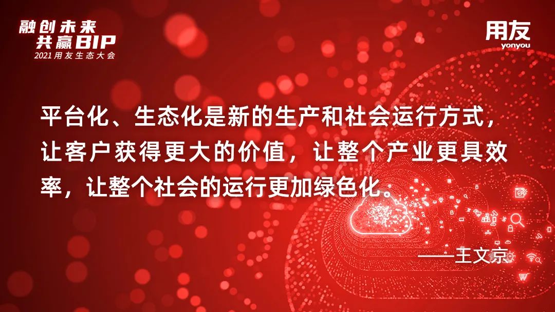 未来,用友将继续以更大力度推进强平台、强生态“双轮驱动”战略,构建和运行全球领先的商业创新平台YonBIP,和十万家生态伙伴一起,连接汇聚亿级社群个人,服务千万家企业客户,为客户创造单一组织不能企及的价值,为中国和全球的商业创新创造独特价值,并创造巨量的就业和创业机会,推动商业革新进步,促进经济高质量发展,共同把握数智时代的发展机遇,推进数智时代的商业创新!