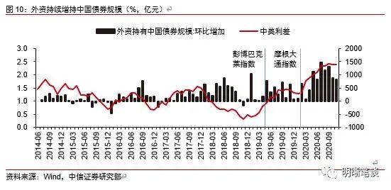 2020年是我国金融市场对外开放加速的一年。2020年中国人民银行主导加强金融基础设施建设、加快推进债券市场基础设施互联互通,债券市场对外开放有所加速,引入更多中长期投资者。2020年外资增持我国债券超过1万亿元,60%以上是境外央行的长期资金,购买的主要品种是国债和政策性金融债。一方面是2019年4月起逐步纳入中国国债和政策性银行债券的彭博巴克莱全球综合指数、2020年2月起逐步纳入高流动性中国政府债券的摩根大通全球新兴市场政府债券指数系列的被动增持;另一方面是2020年5月份以来,国内货币政策回归常态化,市场资金面收紧,驱动中国10年期国债收益率持续上行,而新冠疫情下美联储快速降息和无上限量化宽松的结果导致了美国债券利率一路下行,中美利差持续走阔,境外机构也正不断增持人民币债券,增持幅度创下新高。最后,中国出口高增、外资流入带来人民币汇率升值且升值预期较强,进一步吸引外资增持中国资产。进一步对外开放进程中,预计外资增持中国债券趋势仍将延续。
