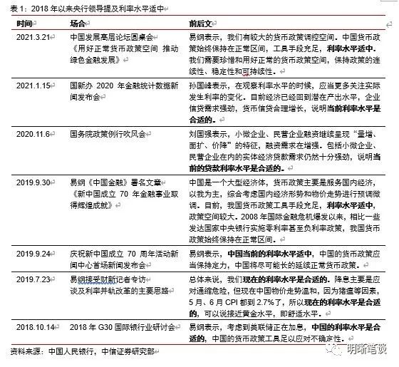 央行领导多次提到“利率水平适中”,并不意味着市场利率保持不变。2018年以来央行领导在多种场合多次提及中国的利率水平是合适的,其中2018年10月和2019年7月易纲行长分别提及“现在的利率水平是合适的”后,十年国债到期收益率仍处于下行趋势中;2019年9月、2021年1月央行领导提出利率水平适中后,十年国债到期收益率出现上行。因而央行领导提到的利率水平适中并非指市场利率维持不变。如果央行所说的利率水平适中是指市场利率,那么市场利率的波动区间历史上最大是50bp(2018年10月~2019年1月),最小是15bp左右。