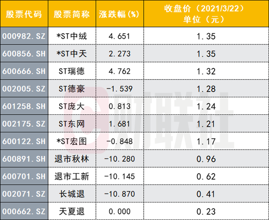 而截至今日收盘,有11家上市公司股价等于或低于1.35元。除了其中的退市秋林(维权)、退市工新(维权)、长城退(维权)、天夏退(维权)等退市公司,其余个股均面临触发交易类“低于1元”强制退市指标中的危险。