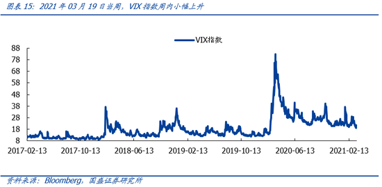 VIX指数通过计算标普500指数的隐含波动率得到,波动率越高则VIX指数越高,也意味着投资者对未来市场的恐慌程度越高。2021年03月19日当周,VIX指数由20.7上升至21.0。