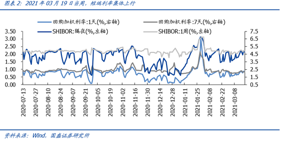 2021年03月19日当周,短端利率集体上行。其中,隔夜Shibor上行35BP至2.14%,7天Shibor上行6BP至2.2%,1天回购利率上行33BP至2.16%,7天回购利率上行13BP至2.19%。