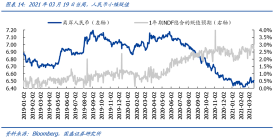 2021年03月19日当周,离岸人民币汇率上升至6.51,1年期NDF上升至6.69。