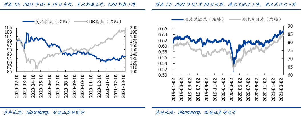 2021年03月19日当周,美元指数上升至91.95,CRB指数下降至188.75,澳元兑欧元下降至0.65,澳元兑日元下降至84.31。