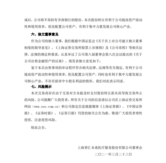 3月22日消息,未来股份发布公告称,公司将所持有的齐商银行1.11%股份以1.3亿元转让给淄博齐信;本次股份转让完成后,公司将不再持有齐商银行的股份。