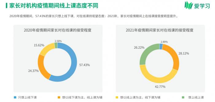 家长对机构在疫情期间上在线课的接受度较去年也有明显提升。报告显示,2021年家长选择“线上课为主,线下课为辅”和“只想上线上课”的比例为68%,超过去年的17%。但是,相比一二线城市,下沉市场(3-6线城市)在线渗透率可提高空间仍然巨大。