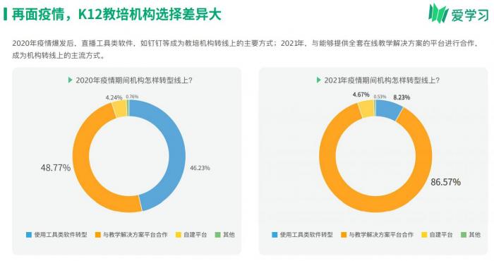 与此同时,机构转在线的方式从疫情初期的借助直播平台逐渐过渡到与第三方教学解决方案平台合作为主。2020年疫情暴发后,直播工具类软件,如钉钉等成为教培机构转线上的主要方式。但在2021年,86.57%的机构选择与能够提供全套在线教学解决方案的平台进行合作。